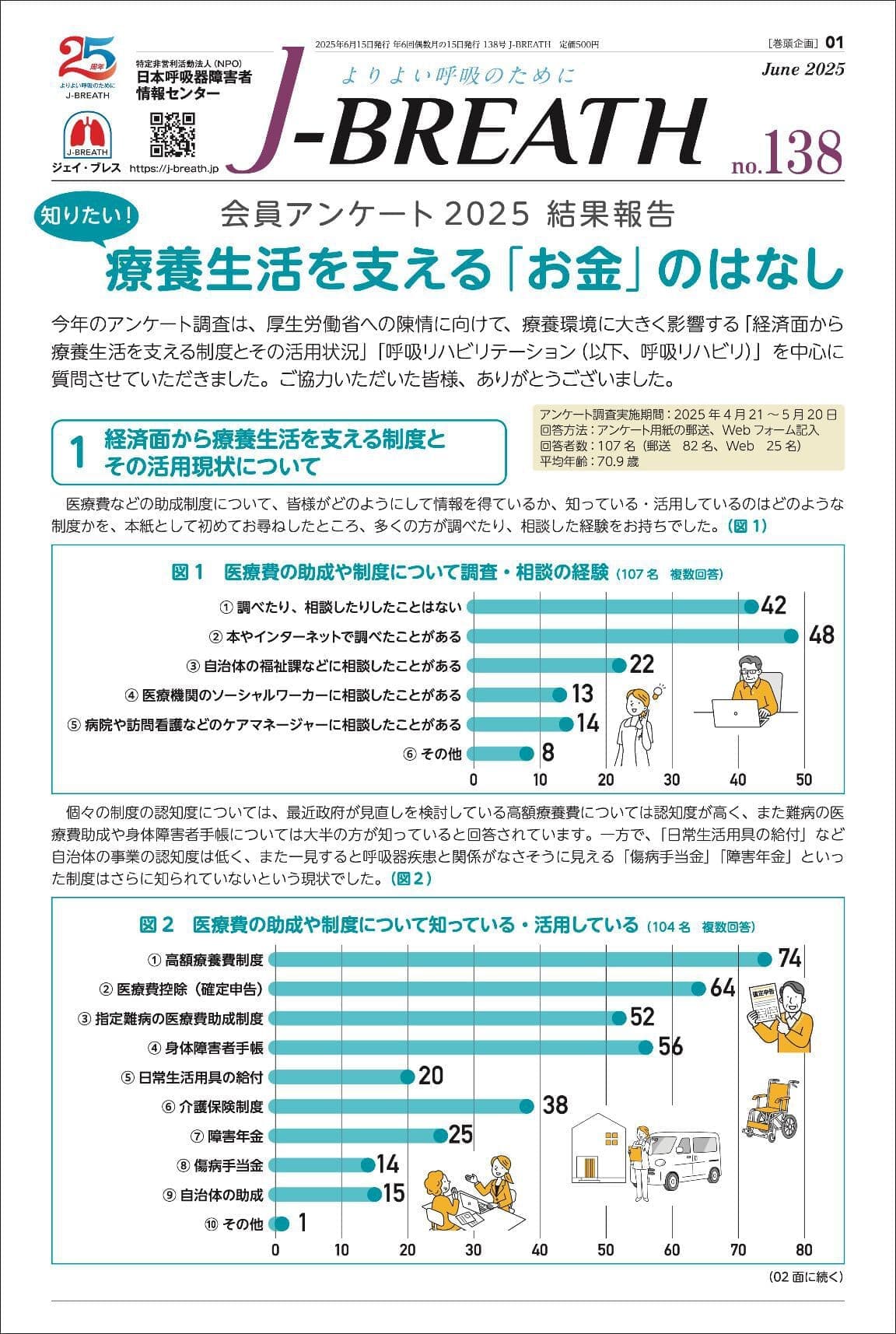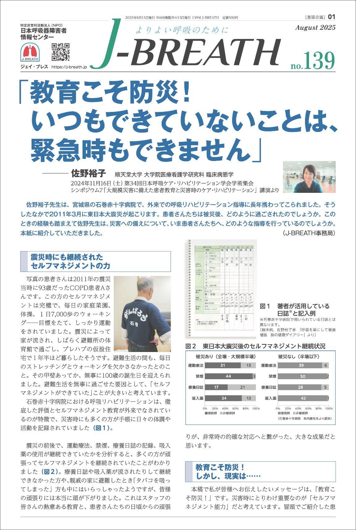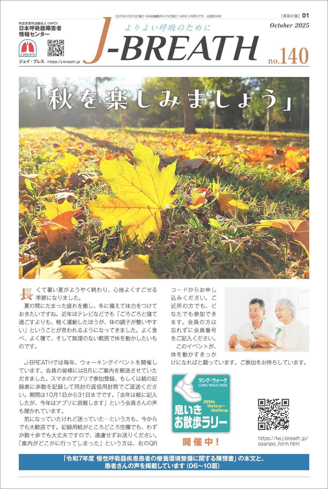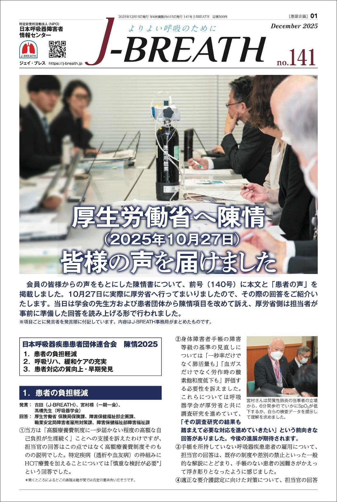 COPD(慢性閉塞性肺疾患) 間質性肺炎(肺線維症) 肺NTM症・肺MAC症(非結核性抗酸菌症) 新型コロナウイルス感染症 呼吸リハビリ 栄養療法 在宅酸素療法(HOT) 薬物療法・吸入療法 医療・福祉 災害への備え 旅行の際の注意点 身体障害者手帳 「J-BREATH」バックナンバー 「J-BREATH」バックナンバー 表紙をクリックすると、掲載内容の目次をご確認いただけます。130号以降のバックナンバーを当サイトにて販売しております。 物販サイトはこちら 2026 2025 2024 2023 2026年 第147号 12月 第146号 10月 第145号 8月 第144号 6月 第143号 4月 第142号 2月 2025年 第141号 12月 第140号 10月 第139号 8月 第138号 6月 第137号 4月 第136号 2月 ページのTOPへ 2024年 第135号 12月 第134号 10月 第133号 8月 第132号 6月 第131号 4月 第130号 2月 ページのTOPへ 2023年 第129号 12月 第128号 10月 第127号 8月 第126号 6月 第125号 4月 第124号 2月 ページのTOPへ